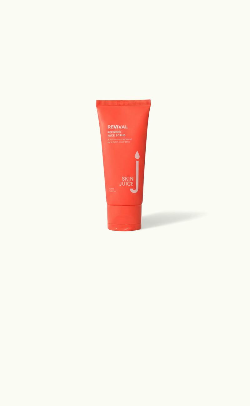 The Skin Juice Revival refining face scrub contains jojoba beads (rounder, smoother beads) and kaolin clay to lift and remove excess oils and dead skin cells.